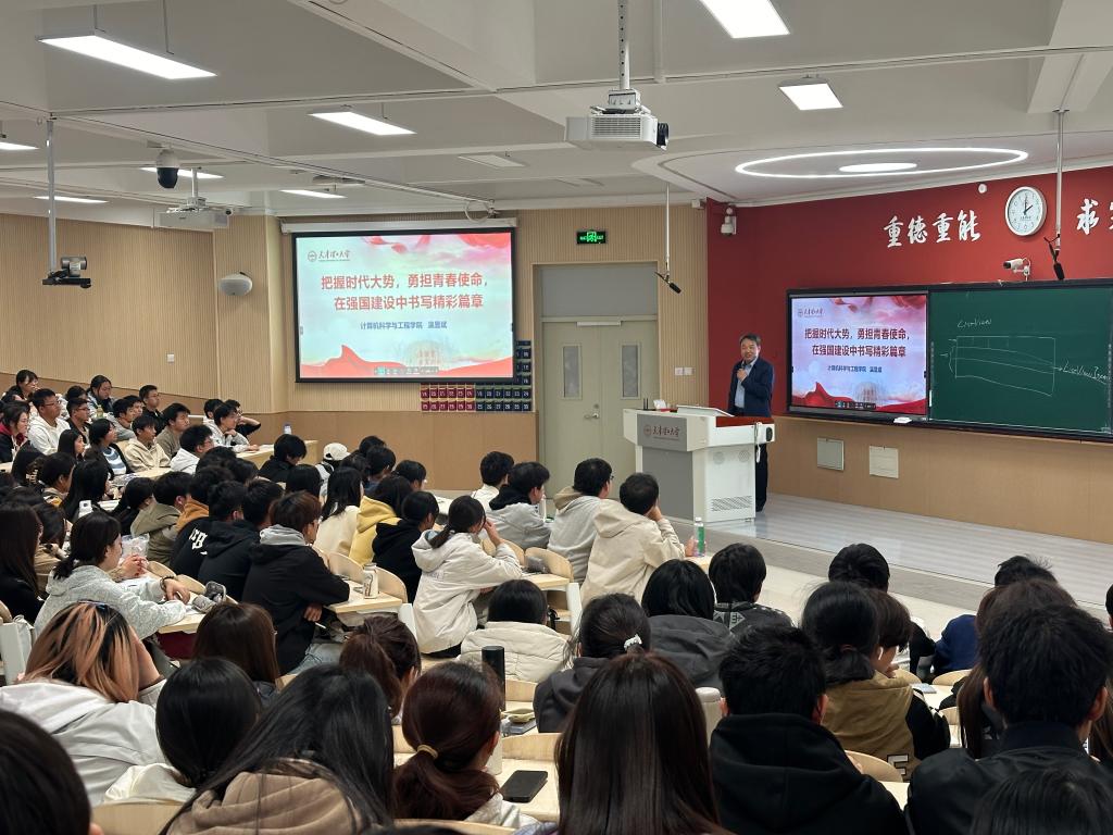 为引导广大学生认清时代大势、明确使命担当,近日,计算机科学与工程学院党委书记韩萌和学院常务副院长温显斌以同上一堂课的形式,分别为大一年级不同专业学生讲授了2025年秋季学期形势政策教育开学第一课。